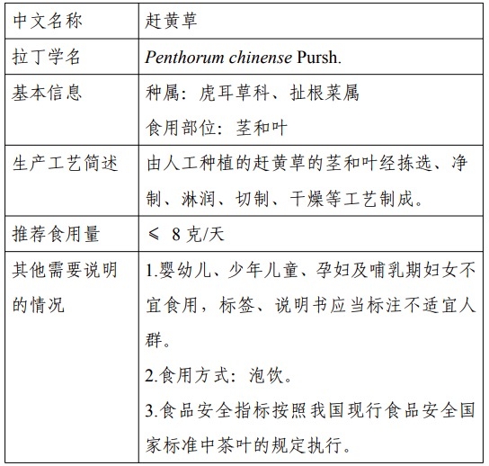 趕黃草是由人工種植的趕黃草地上部分的全株經(jīng)揀選、凈制、淋潤(rùn)、切制、干燥等工藝制成。趕黃草于2016年申報(bào)新食品原料,2020年6月,國(guó)家衛(wèi)生健康委員發(fā)布《關(guān)于瑞士乳桿菌R0052等53種“三新食品”的公告(2020年第4號(hào))》,正式批準(zhǔn)趕黃草為新食品原料。