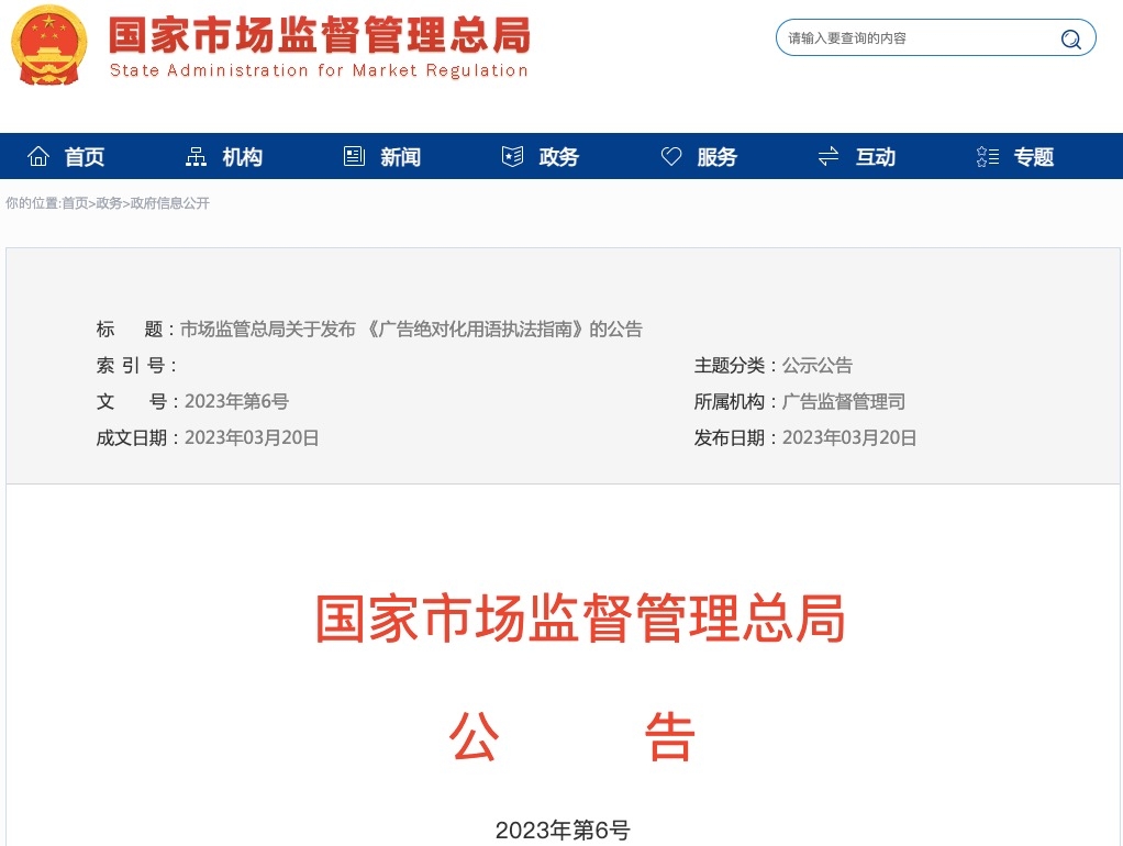 為進(jìn)一步規(guī)范廣告絕對化用語執(zhí)法,保護(hù)自然人、法人和其他組織的合法權(quán)益,維護(hù)廣告市場秩序,市場監(jiān)管總局于近日發(fā)布《廣告絕對化用語執(zhí)法指南》(以下簡稱《指南》),為市場監(jiān)管部門開展廣告絕對化用語監(jiān)管執(zhí)法提供指引。