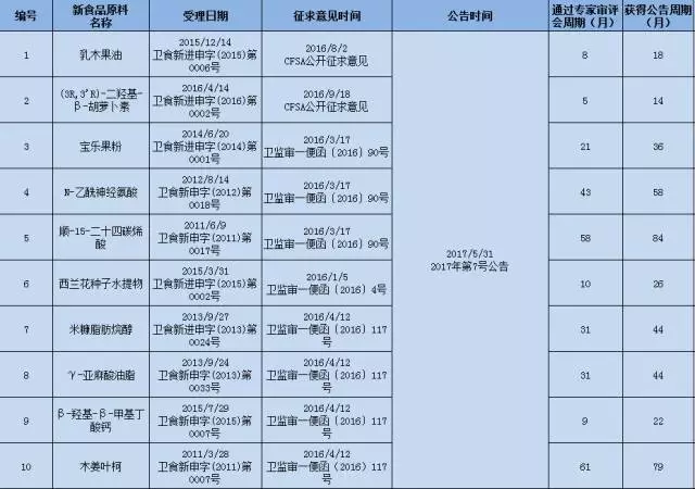 2017年6月13日,時隔兩年,國家衛(wèi)計委公告10種新食品原料,我司對此次公告的10種新食品原料申報周期進行了分析(詳見下表),從獲得受理到批準公告最短周期為14個月,最長84個月,平均42.5個月。另外,企業(yè)獲得受理前須完成成分分析、衛(wèi)生學、急性經(jīng)口毒性、三項遺傳毒性、90天經(jīng)口毒性、致畸、安全性評估意見等報告及資料,也需要很長時間。