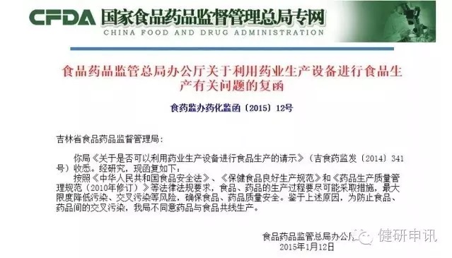2016年9月,廣東省食藥監(jiān)局批復(fù)中山市食藥監(jiān)局“關(guān)于普通食品與保健食品共線生產(chǎn)的有關(guān)問題”一函被公開。此函中明確指出“未禁止普通食品與保健食品共線生產(chǎn),但同一車間不得同時(shí)生產(chǎn)不同的產(chǎn)品”。