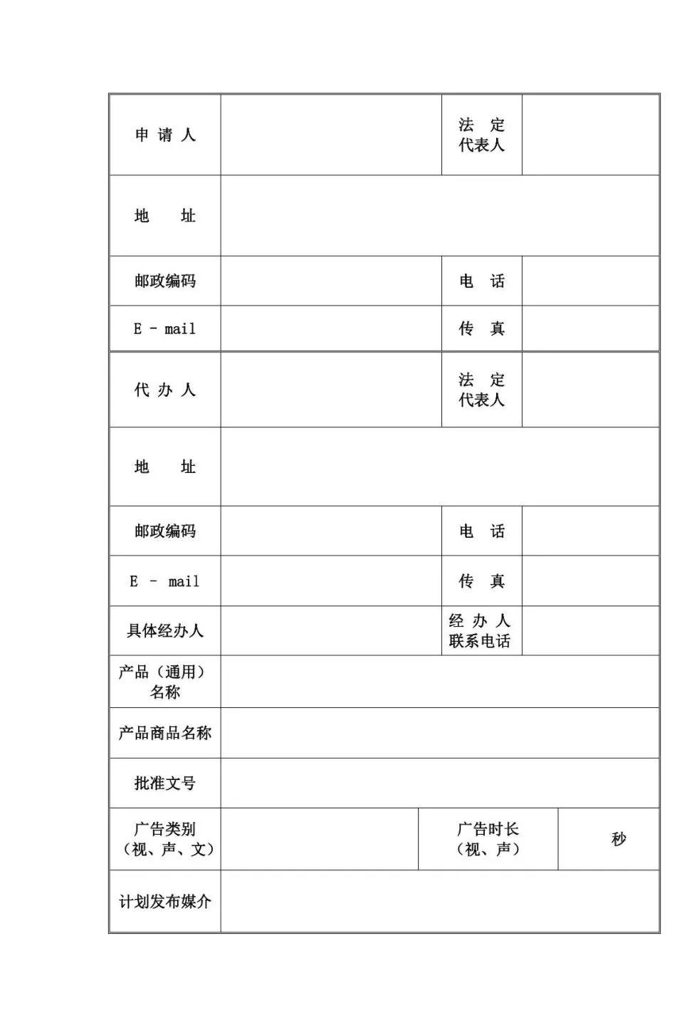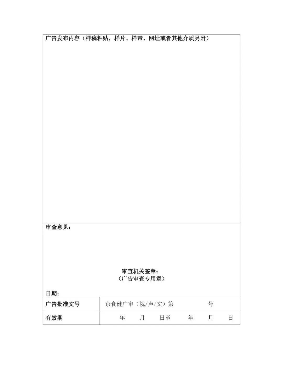 1、《廣告審查表》一式四份。如申請(qǐng)發(fā)布電視廣告、聲音廣告,需另附音、視頻光盤及文字腳本。