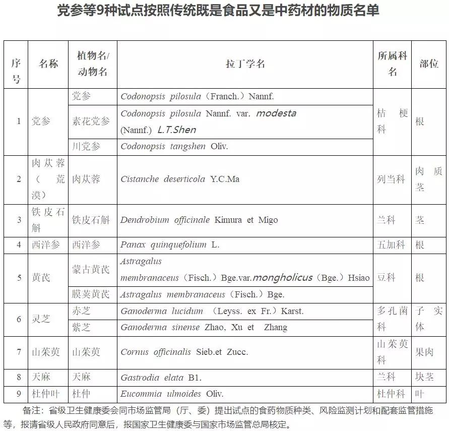 關(guān)于對(duì)黨參等9種物質(zhì)開展按照傳統(tǒng)既是食品又是中藥材