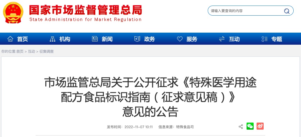 為指導特殊醫(yī)學用途配方食品(以下簡稱特醫(yī)食品)規(guī)范標識,引導科學合理使用特醫(yī)食品,根據有關法律法規(guī),市場監(jiān)管總局組織制定了《特殊醫(yī)學用途配方食品標識指南(征求意見稿)》,現(xiàn)面向社會公開征求意見,意見建議反饋截止時間為2022年11月25日。公眾可以通過以下途徑和方式提出意見建議: